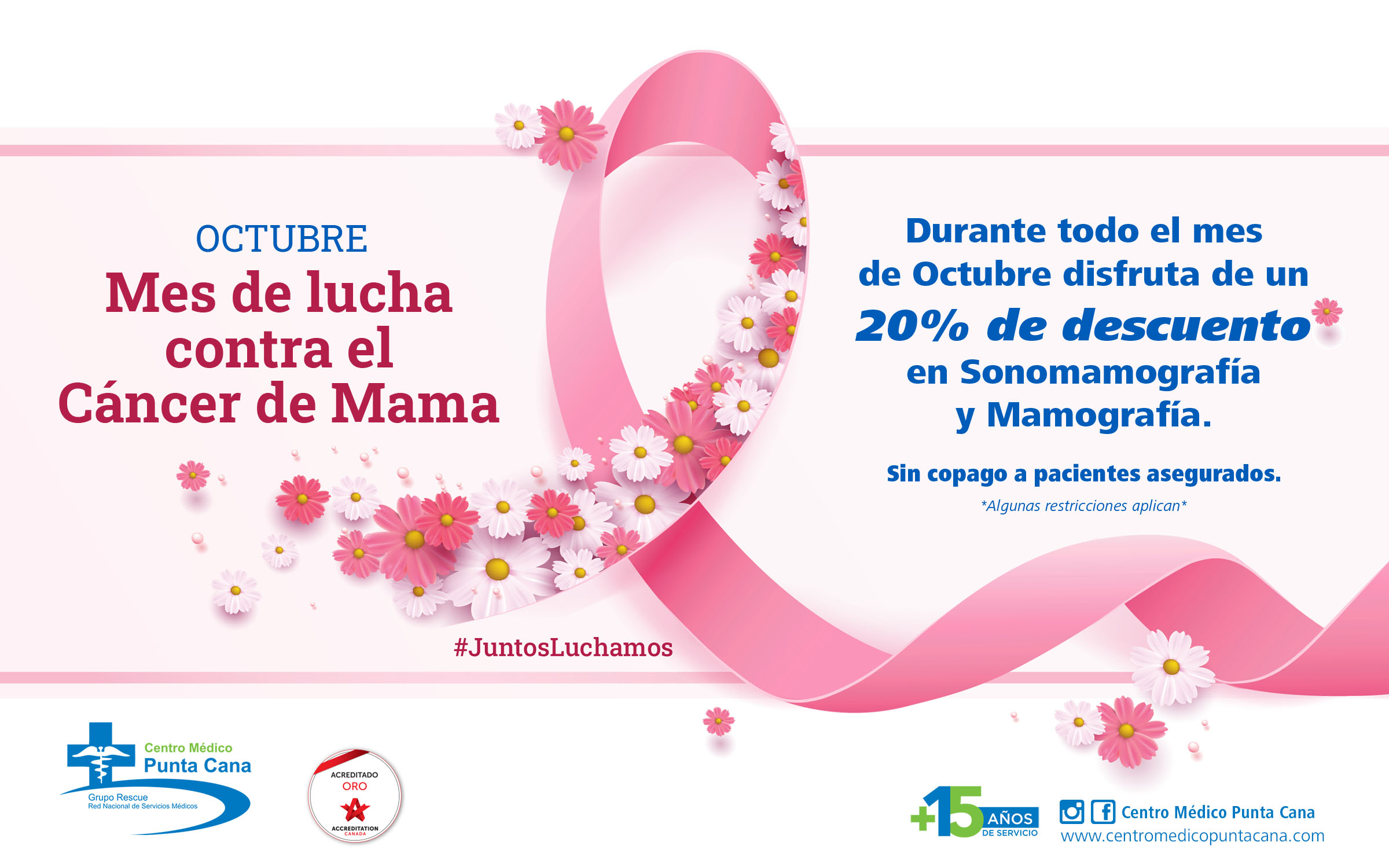 Como parte de sus aportes a lucha contra el cáncer de mama el Centro Médico Punta Cana está ofreciendo un 20 por ciento de descuento en Sonomamografía y Mamografía todo el mes de octubre, sin copago a pacientes asegurados.